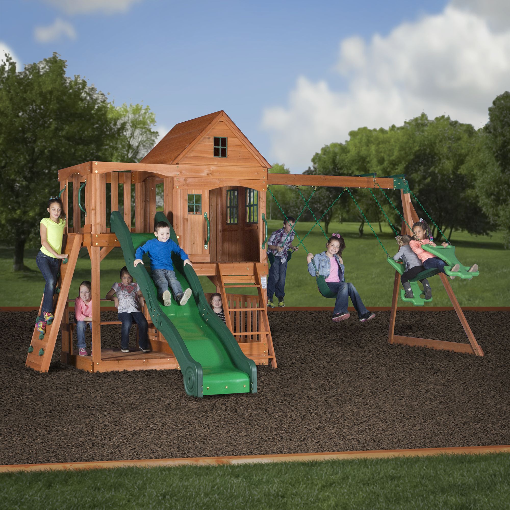 In addition to our wooden swing sets playsets and playhouses we also offer backyard leisure products. Backyard adventures has the largest selection of tree house swing sets treehouse playsets in the us. At backyard adventures our goal is to transport families back to a simpler time when play still involved fresh air friendship exercise and imagination. Peak backyard playsets are modular in design and come standard with our most popular features like rock walls and tire swivel swings.